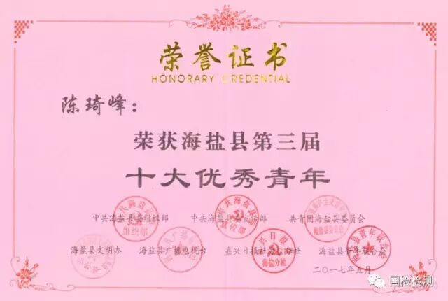 5月4日,海盐举行纪念了“五四”运动98周年暨第三届“十大杰出青年”表彰大会。国检公司副总工程师陈琦峰继荣获“优秀共产党员”称号后,又荣获“海盐县十大优秀青年”称号。